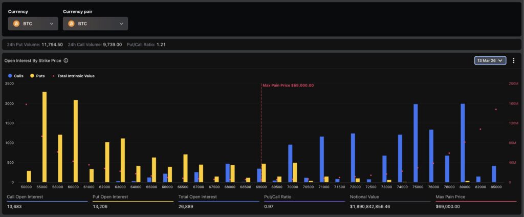 Today, March 13th, around 27,000 Bitcoin options contracts are expiring with a total notional value of roughly $1.9 billion. This amount is below the usual size, so no significant impact on spot markets is expected.