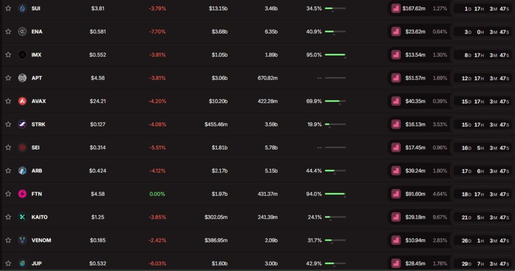 - ENA: 172 million ENA tokens (approximately $102 million) will be released into the market. This corresponds to 1.15% of the total supply and stands out as the largest unlock of the week.