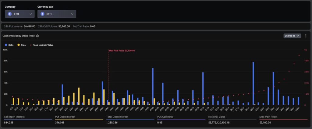 Ethereum put/call ratio stands at 0.45, with max pain at $3,100. Total ETH options open interest is around $11 billion and has been declining since August. According to Deribit analysts, Ethereum options positioning reflects caution, not panic.