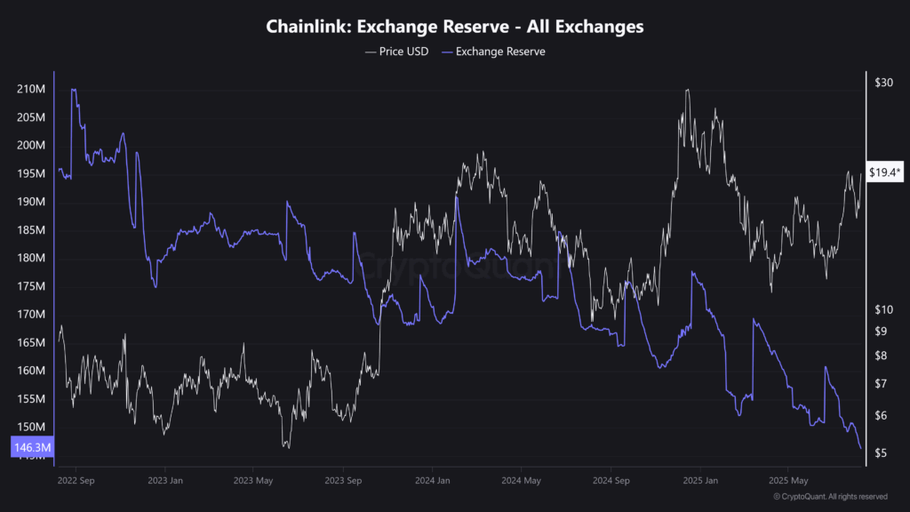 Chainlink’s exchange reserves have dropped by 16% since the beginning of the year to 146.2 million LINK. However, LINK price increased by 15%, rising from $15.5 to over $19. Santiment data revealed renewed accumulation of large LINK amounts in on-chain wallets. At the beginning of August, wallets holding between $100K and $1M LINK increased by 4.2%. Additionally, Chainlink Reserve, an application converting protocol revenues into LINK purchases, was launched in August, strengthening long-term accumulation trends.