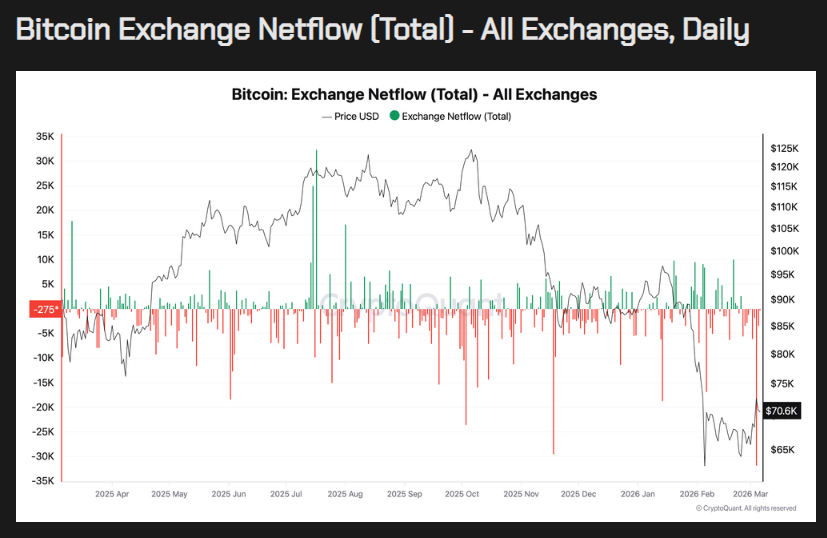 “In early March 2026, a large green bar of around $1.1 billion was recorded, representing a significant liquidity inflow to exchanges. After that, netflow declined to –$37.5 million.”
