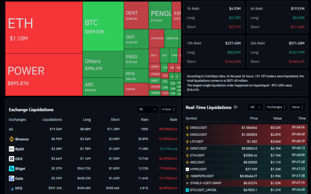 Actually, improving investor sentiment created significant pressure on traders holding bearish positions. According to CoinGlass, over 131,000 traders were liquidated in the past 24 hours, with total liquidations surpassing $571 million. Approximately $468.6 million of this came from short positions.