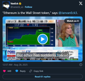 Jan van Eck, CEO of investment management giant VanEck, made notable remarks about Ethereum. Speaking to Fox Business, van Eck stated that banks and financial institutions will prefer Ethereum for conducting stablecoin transactions, making ETH the “Wall Street token.”