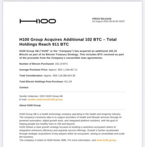 As investors continue to seek safe-haven assets, H100’s move reaffirms Bitcoin’s position as “digital gold.”