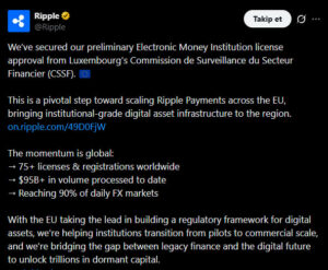 Ripple officially announced that it has received preliminary approval for an Electronic Money Institution (EMI) license from Luxembourg’s financial regulator, the CSSF. This milestone is seen as a critical threshold for Ripple to scale its operations institutionally within the European Union and to provide digital payment solutions more comprehensively across the region.