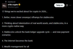 a16z Crypto also predicts a new phase in the tokenization of real-world assets (RWAs). According to the report, this process will gradually evolve into a more “natively crypto” structure. Stablecoins are expected to become one of the critical infrastructure components of this new financial architecture. This transformation could enable traditional assets to be represented more effectively on the blockchain and become more accessible on a global scale.