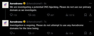 The Aerodrome team confirmed that centralized domains ending with .finance and .box may have been taken over by attackers. As a result, users are advised not to visit the platform through these addresses.