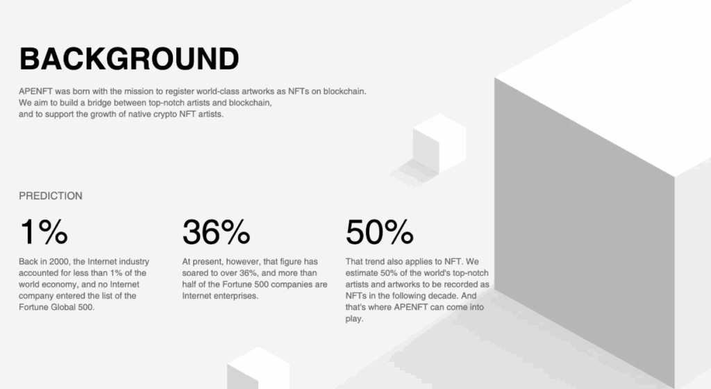 APENFT is a pioneering project that bridges blockchain technology with the art world. Founded on March 29, 2021, in Singapore by Justin Sun and Sydney Xiong, it operates on Ethereum and TRON for versatility and accessibility. APENFT functions as an NFT marketplace, using BTFS decentralized storage to ensure data security. Notably, APENFT is recognized as legal tender in Dominica.