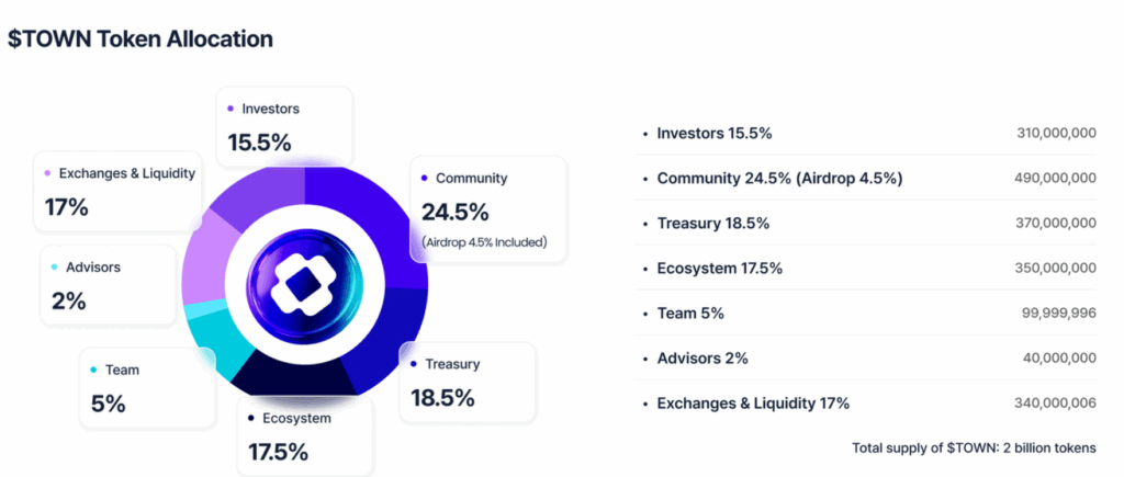 $TOWN: Total supply 2 billion, distributed among investors, community, treasury, ecosystem, liquidity, team, and advisors.