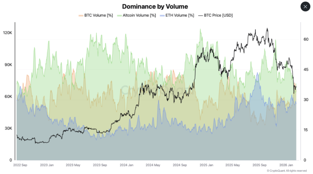 It’s not new that Bitcoin’s volume share rises in times of market stress. But this rotation is sharper and faster than usual. A roughly 50% drop in altcoin activity highlights how investors reprioritize.