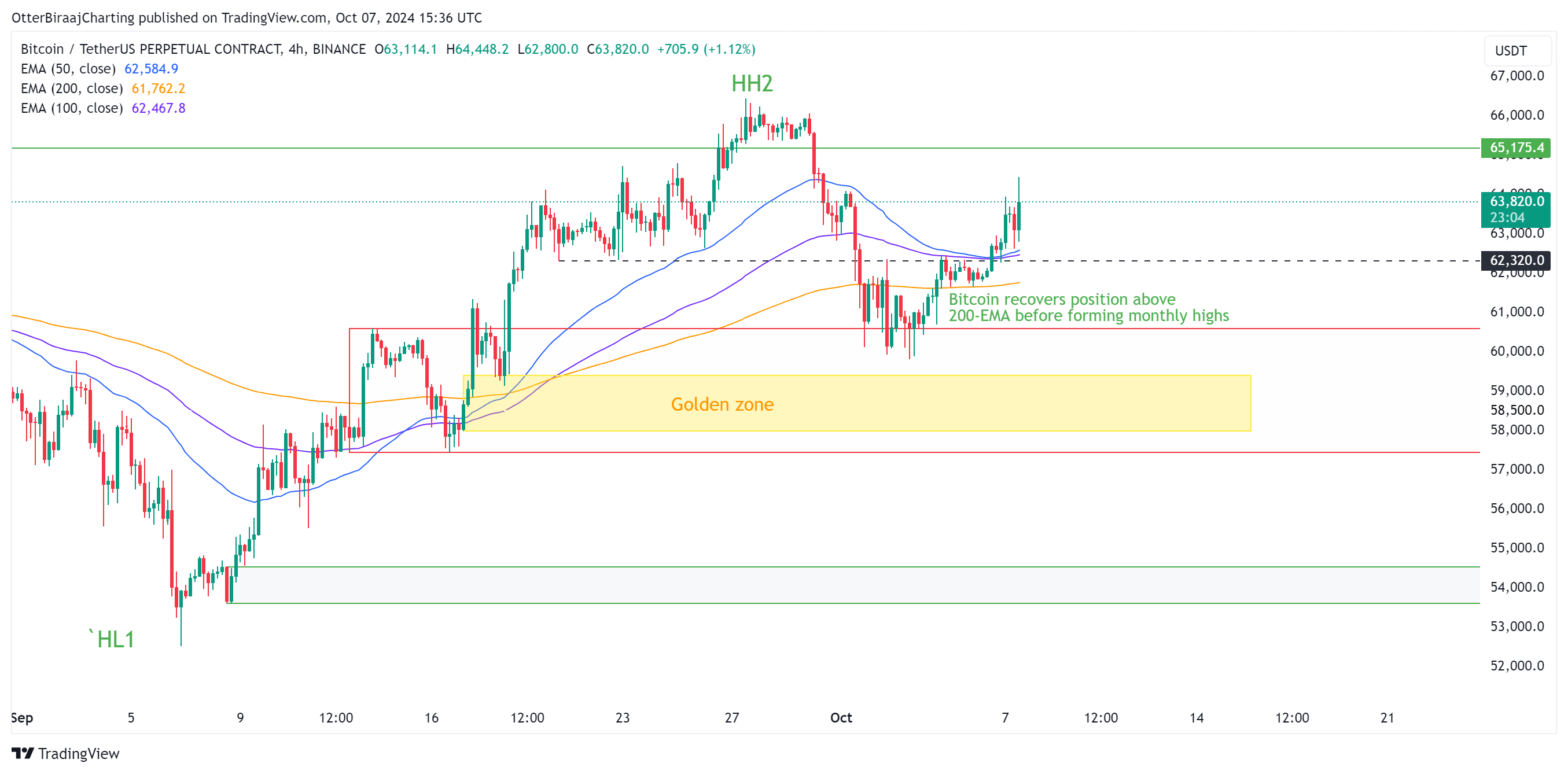 Bitcoin’s recent rally to $64,448 has reinforced a bullish trend, locking in a key technical pattern, according to analysts. After dropping to a recent low of $59,815 on Oct. 3, Bitcoin’s price surged by 7.75%, reaching its monthly high on Oct. 7. This movement confirms a trend change, with the 200-day EMA acting as a crucial support level.