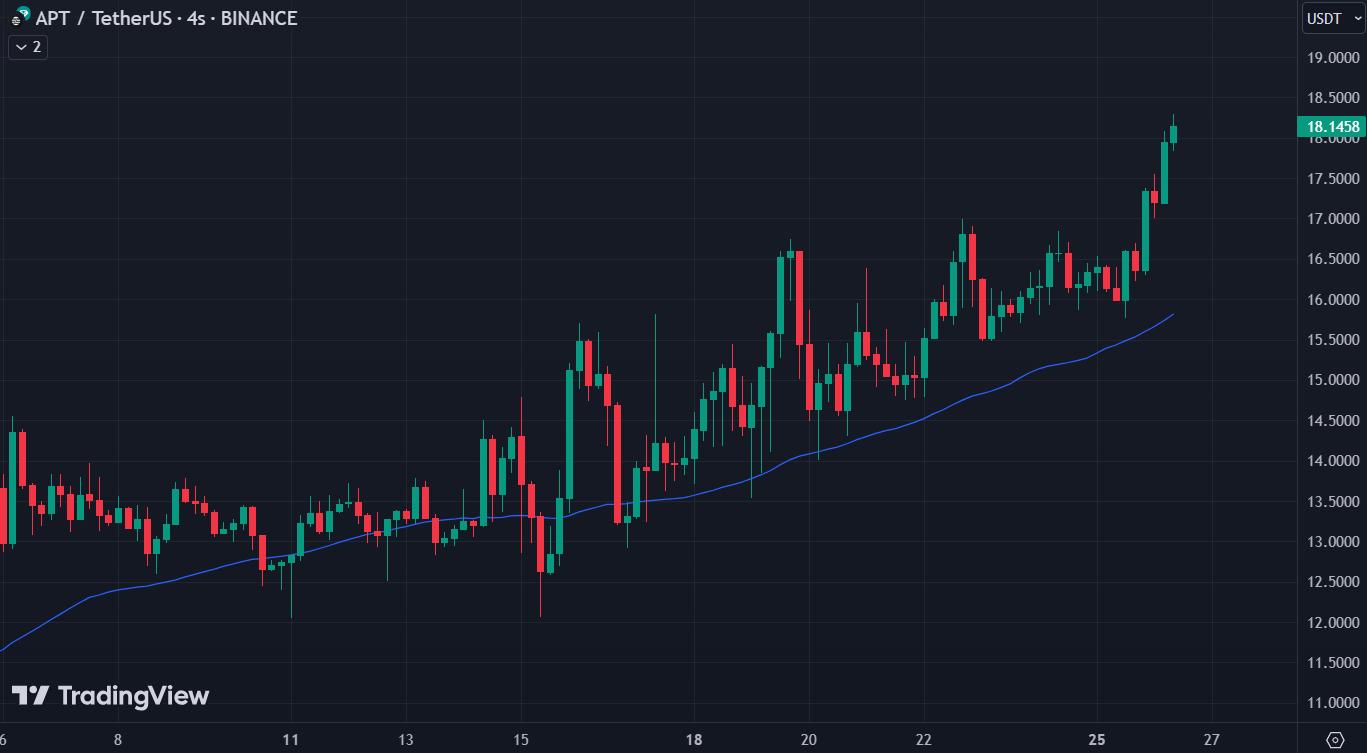 With a 5% increase, Aptos is trading over $18. In addition, Aptos offered its investors a buying opportunity during the past week. Aptos, which dropped to $11 on March 15, is currently trading 50% above that level.