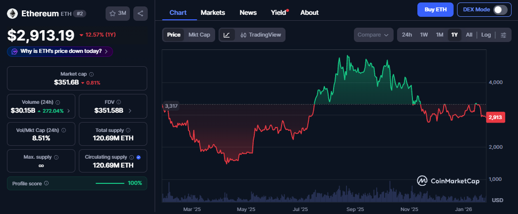 Ethereum has struggled to maintain momentum in recent weeks. Over the past seven days, ETH has fallen by more than 10%, wiping out all gains recorded earlier in the year. At the time of writing, Ethereum is trading near $2,913, marking a year-to-date decline of roughly 5%.