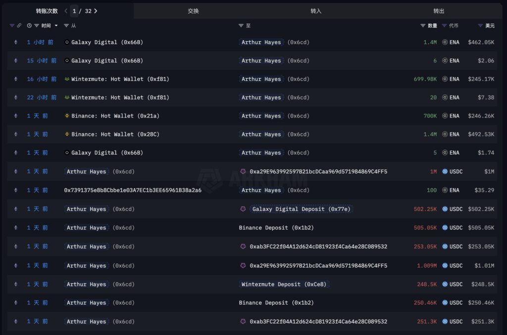 Tracking Hayes’ wallet activity reveals that he first sent 755,000 USDC to Binance, where he received 2.1 million ENA. Then, he transferred 248,000 USDC to Wintermute and received 700,000 ENA. Finally, he sent 502,000 USDC to Galaxy Digital, acquiring another 1.4 million ENA.