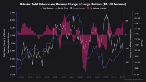 According to CryptoQuant, wallets holding between 1,000 and 10,000 BTC have significantly increased their balances over the last seven days. Analyst JA Maartun reported that holdings in this category have grown from 3.436 million BTC to 3.504 million BTC, marking the largest wave of accumulation since late September.