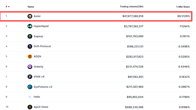 Decentralized perpetual contract protocol Aster (ASTER) continued its rapid growth on September 28, reaching nearly 90% DEX market share with $47 billion in 24-hour trading volume. Competitors like Hyperliquid, Superp, and Drift Protocol were left behind.