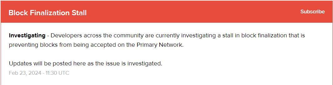 Avalanche Blockchain experiencing an outage. According to Avalanche’s website Mainnet has been outaged for almost 25 minutes. On its website, the Avalanche Blockchain team wrote that updates will be shared.