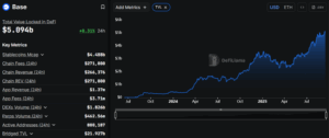 Coinbase-backed Layer-2 network Base is rapidly climbing the ranks in Ethereum scaling solutions. With a total value locked (TVL) of $5 billion, $4.5 billion in stablecoin market cap, and $100,000 daily revenue, Base demonstrates strong real user activity and adoption. Metrics like weekly transaction counts and daily active addresses further cement the platform’s leadership.