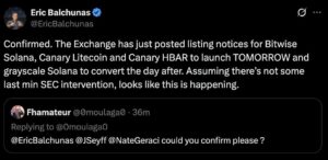 It’s a major day for the crypto market. The Bitwise Solana Staking ETF, Canary Litecoin ETF, and Canary HBAR ETF are officially launching today. Bloomberg’s senior ETF analyst Eric Balchunas confirmed in a statement yesterday that these three ETFs would start trading today. Balchunas also noted that unless there is a last-minute intervention from the SEC, Grayscale’s Solana fund conversion is expected to take place tomorrow.