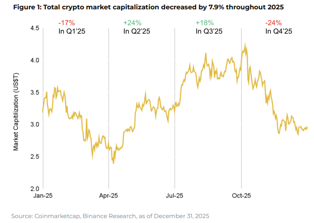 Binance latest annual outlook frames 2025 as one of the most contradictory years in crypto market history. The industry reached unprecedented scale, yet struggled to translate those milestones into sustained performance. Total crypto market capitalization briefly surpassed the $4 trillion mark, Bitcoin printed new all-time highs, and institutional participation expanded across ETFs, stablecoins, and tokenized assets. Despite these achievements, persistent macroeconomic pressure and regulatory friction ultimately capped market momentum.