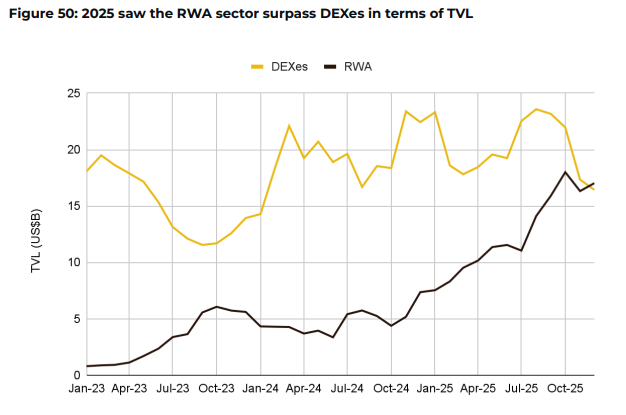Decentralized finance continued its gradual shift toward institutional maturity. Total value locked stabilized around $124 billion, while capital increasingly concentrated in stablecoins and yield-bearing products. A notable milestone occurred when real-world asset (RWA) TVL surpassed decentralized exchanges, driven by tokenized treasuries and equities.
