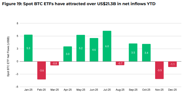 Institutional demand intensified beneath the surface. U.S. spot Bitcoin ETFs recorded more than $21 billion in net inflows, while corporate treasuries accumulated over 1.1 million BTC—approximately 5.5% of total supply. Network security also improved, with hash rate surpassing the 1 zettahash-per-second threshold.