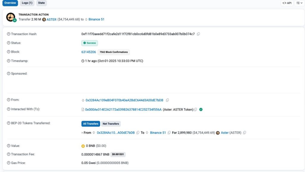 On-chain trackers reported large ASTER deposits into Binance spot wallets. A small test transfer was followed by a major transaction worth $4.8 million.