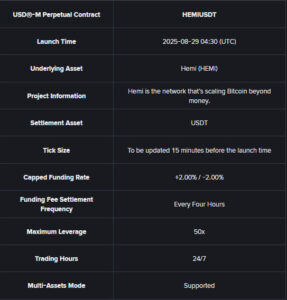 Additionally, the HEMIUSDT Perpetual Contract on Binance Futures will go live at 07:30 (TSI) on August 29, 2025, with leverage of up to 50x. This new futures product allows users to implement leveraged trading strategies with HEMI tokens.
