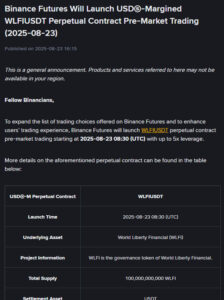 Binance Futures announced that it will launch the USDⓈ-Margined WLFIUSDT Perpetual Contract on August 23, 2025, at 08:30 AM (UTC).
