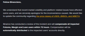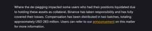 “When the loss in value led to the liquidation of positions held by some users using these assets as collateral, Binance took full responsibility and fully covered their losses. The safety and satisfaction of our users will always remain our top priority.”