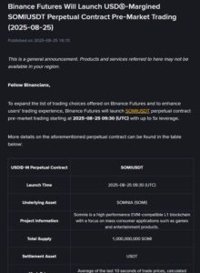 The leading crypto platform Binance Futures is making a new move by adding $SOMI token futures. The SOMIUSDT perpetual contract will open for pre-market trading on August 25, 2025.