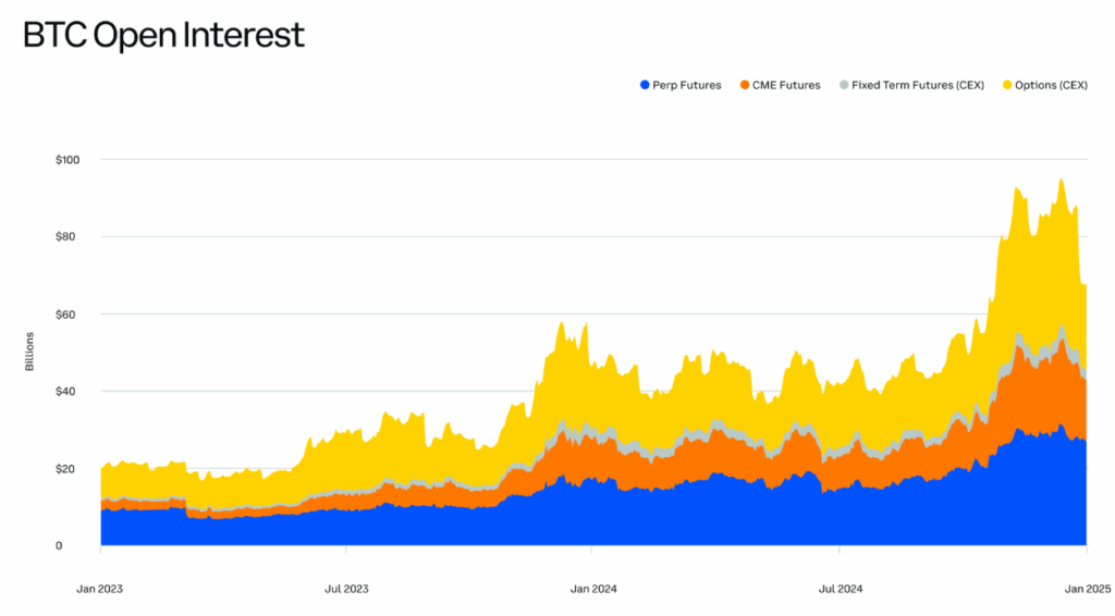 Leverage levels in derivatives markets are rising. Total open interest stands at around $96.2 billion. Especially since the approval of spot Bitcoin ETFs in early 2024, leverage has increased further, bringing higher risk of sudden price swings. Open interest in futures surged from $7.7 billion to $52.8 billion, while options rose from $3.2 billion to $43.4 billion, pushing total derivatives open interest to $114 billion. This shows clear growth and rising investor interest in derivatives.