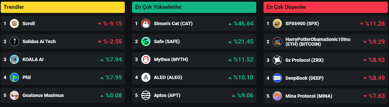 Scroll, KOALA AI, Solidus Ai Tech, KOALA AI and Goatseus Maximus are among the most trending coins in the crypto market in the last 24 hours. Simon’s Cat (CAT), ALEX (ALEX) and Mythos (MYTH) are the most rising. The list of the biggest losers in the market includes SPX6900 (SPX), DeepBook (DEEP) and 0x Protocol (ZRX).