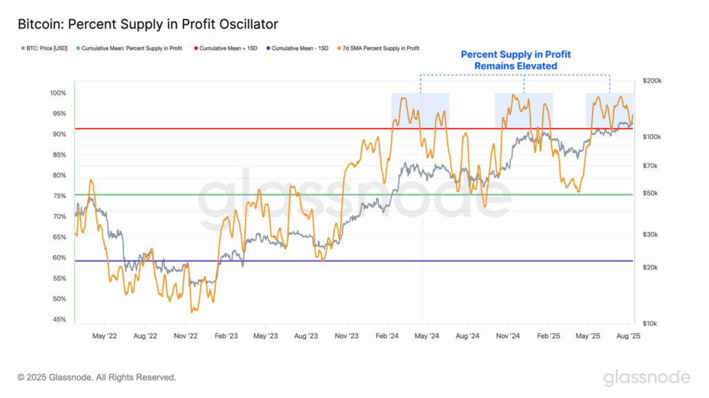 Glassnode data revealed that when Bitcoin reached a new all-time high, the profitable BTC supply surged to 99%. This figure was around 95% before the July correction and has never dropped below the cumulative average of 92% plus one standard deviation.