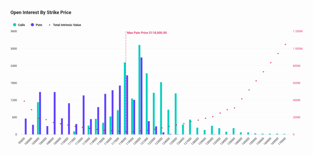 According to Deribit data, Bitcoin’s maximum pain point was set at $117,000. At the time of writing, BTC traded at $118,995. The put-call ratio for expiring Bitcoin options stood at 0.90, indicating more call positions than puts — a bullish signal. The nominal value of Bitcoin options reached $4.78 billion, with 40,185 open contracts.