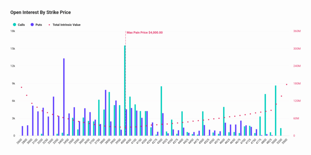 On the Ethereum side, the maximum pain point was $4,000, with ETH trading at $4,629. The put-call ratio came in at 1.02, showing a slight tilt toward put positions. Ethereum options had a nominal value of $1.33 billion and 287,946 open contracts.