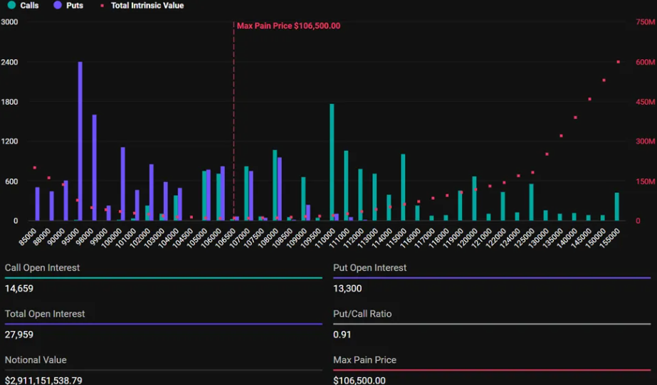 According to Deribit exchange data, approximately 27,959 Bitcoin options contracts are reaching expiration today. The total nominal value of these contracts is around $2.9 billion. Another notable data point is Bitcoin’s max pain level set at $106,500, which represents the price point where option holders experience the greatest loss.