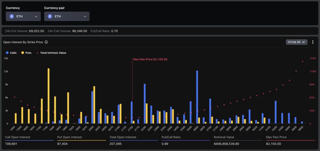 On the Ethereum side, the picture is similar. Price is hovering near $1,950, notional open interest is roughly $425 million, and max pain sits around $2,100.