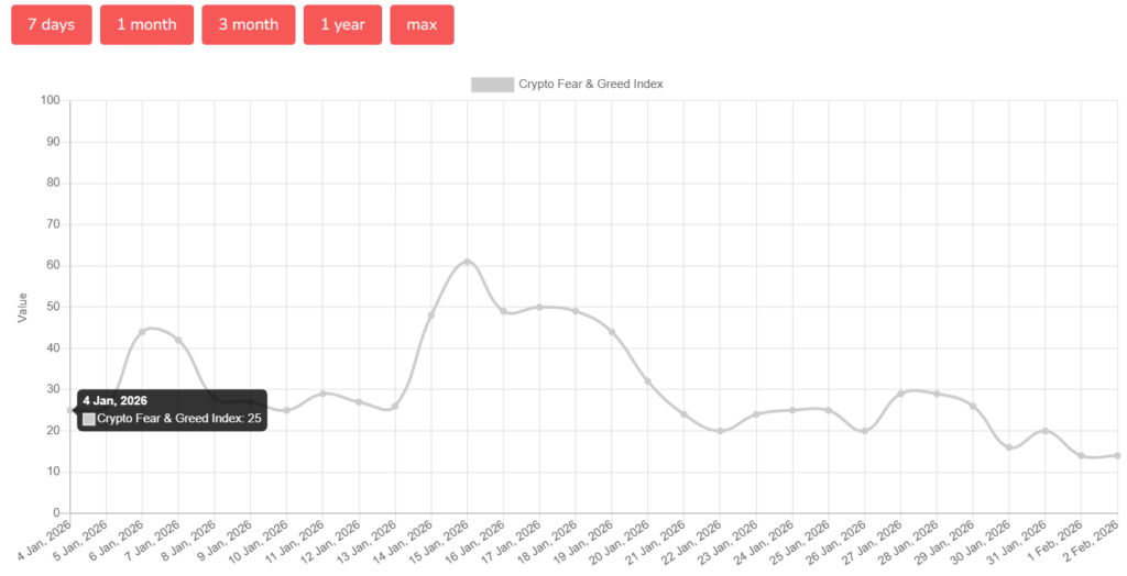 The index has remained below 30 since BTC’s correction began on January 22. During Saturday’s market-wide crash, where over $2.5 billion in leveraged positions were liquidated, the index dropped to 14 – the lowest level since mid-December.