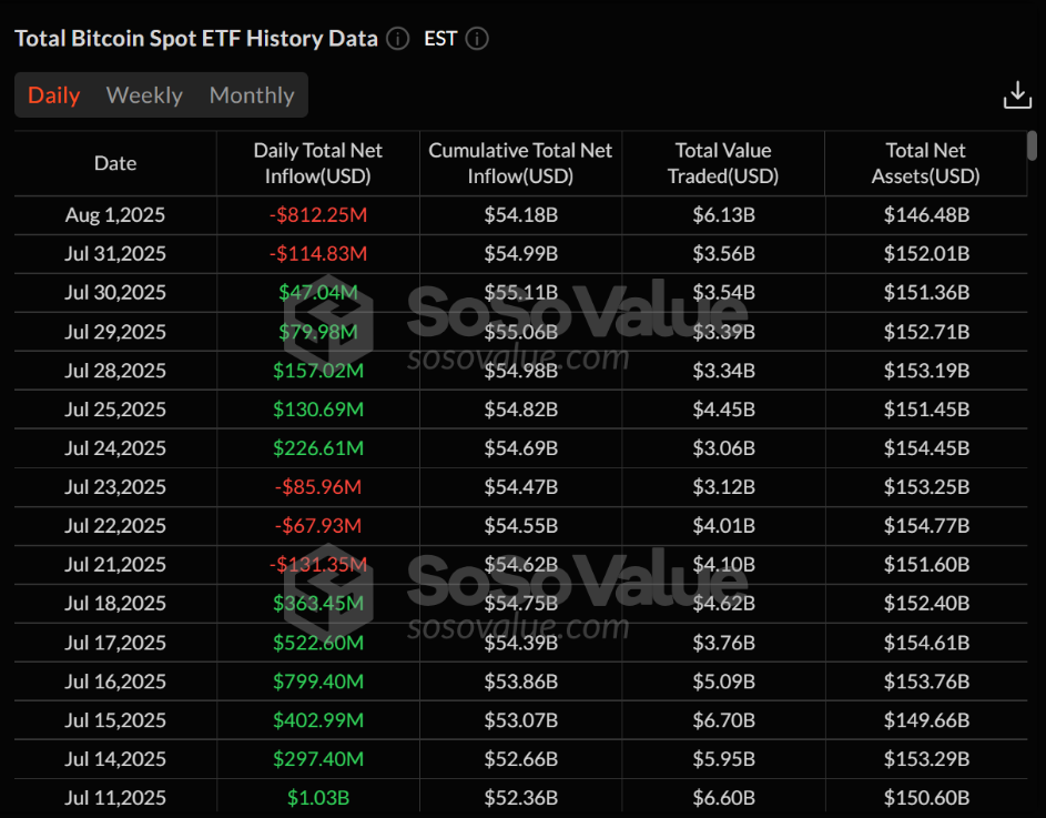 Spot Bitcoin ETFs saw a massive $812.25 million in net outflows on Friday, marking the second-largest daily loss in their history. This sharp drop ended a week-long run of consistent inflows. According to SoSoValue, the cumulative net inflow for Bitcoin ETFs fell to $54.18 billion.