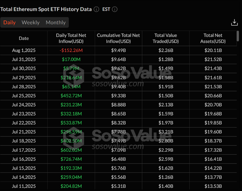 Ether ETFs End 20-Day Inflow Streak with $152M Outflow