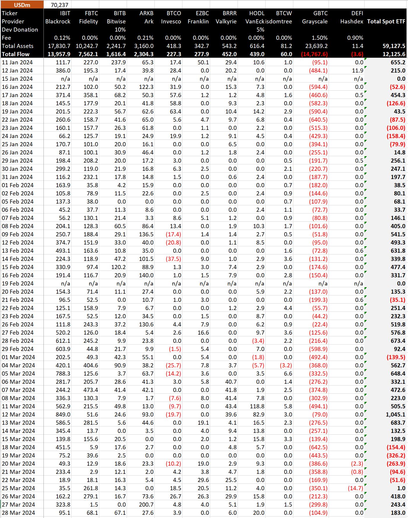 Bitcoin exchange-traded funds (ETFs) continue to attract investor interest, recording their fourth consecutive day of net inflows on March 28th. According to BitMEX data, the total net inflow reached $183.0 million, representing 2,587.9 BTC.