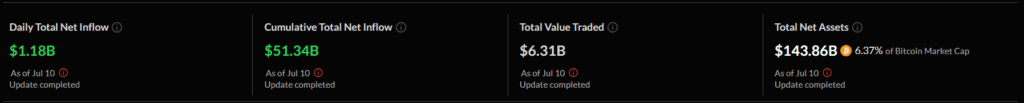 According to Farside Investors, U.S. spot Bitcoin ETFs saw total inflows of $1.17 billion on Thursday. The largest share came from BlackRock’s iShares Bitcoin Trust ETF (IBIT), which led the pack with $448 million in net inflows.