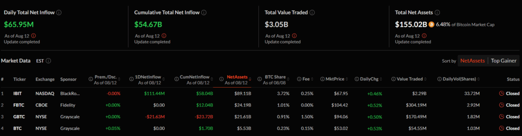 On August 12, 2025, Bitcoin ETFs received a total of $65.95 million in net inflows. The cumulative net inflows reached $54.67 billion. Total trading volume was $3.05 billion. These funds’ total net assets reached $155.02 billion, equivalent to 6.48% of Bitcoin’s market capitalization. BlackRock’s IBIT ETF stood out with $111.44 million in net inflows.