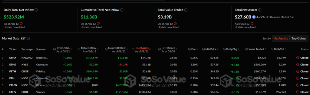 Ethereum ETFs recorded $523.92 million in net inflows on August 12, 2025. Cumulative net inflows reached $11.36 billion. Total trading volume was $3.19 billion. The funds’ total net assets reached $27.60 billion, representing 4.77% of Ethereum’s market capitalization. BlackRock’s ETHA fund received $318.67 million in net inflows.