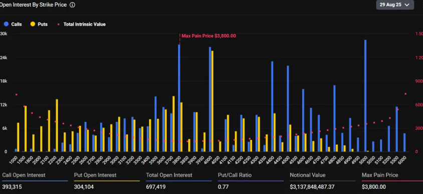 Ethereum’s maximum pain level is set at $3,800, representing the price where most investors would experience maximum losses. Deribit data points to cautious optimism, but analysts highlight relative weakness in Ethereum compared to Bitcoin.
