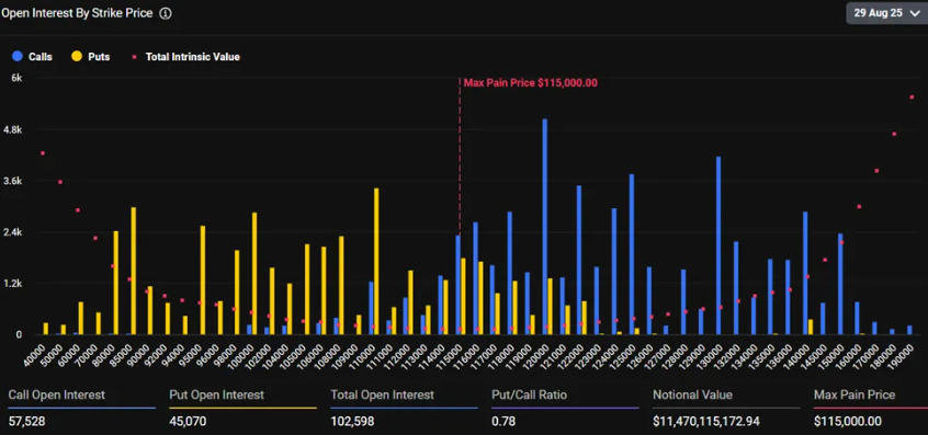 Bitcoin options total $11.47 billion in nominal value. Open interest stands at 102,598 contracts. The Put-to-Call ratio is 0.78, showing a cautiously optimistic outlook. The maximum pain point is positioned at $115,000, where option holders would face the largest financial losses.