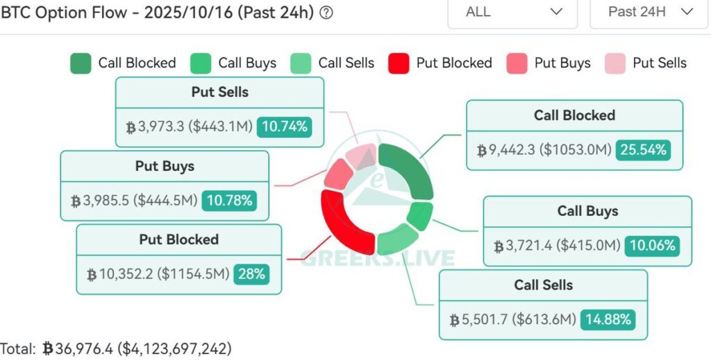 The max pain point — the strike level where most options expire worthless — sits near $116,000, suggesting traders expect limited short-term upside. According to Greeks.Live, short-term out-of-the-money (OTM) puts now account for roughly 28% of total options volume, reflecting the market’s strongest defensive stance since the October 11 pullback.