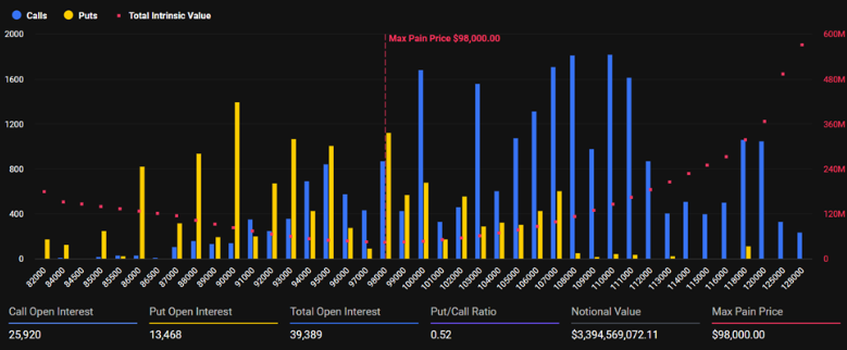The crypto market is experiencing a major derivatives event today as roughly $4 billion worth of Bitcoin (BTC) and Ethereum (ETH) options reach expiry. Both assets are trading below their maximum pain levels, which indicates potential losses for many call option holders. However, investors continue to maintain their positions, reflecting cautious optimism amid volatile market conditions.