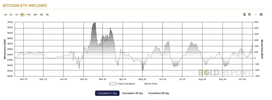 Bitcoin exchange-traded products (ETPs) have seen significant inflows over the past week, marking the largest seven-day inflow since July 2024. Global ETPs have accumulated 25,675 BTC, equivalent to $1.74 billion, during this period. This surge in inflows is driven by renewed investor interest, with Bitcoin (BTC) gaining around 15% since its lows on October 10, bringing it just 8% shy of its all-time high in March.